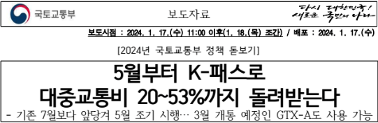 국토교통부가 내놓은 K패스는 정부와 지자체가 1:1로 부담하여 2024년 5월부터 시행되는