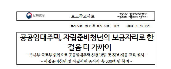 보건복지부(장관 조규홍)는 6월 19일(수), 20일(목) 양일간 아동복지시설이나 위탁가정에서 보호종료되는 자립준비청년이 공공임대주택을 적절히 활용할 수 있도록 자립준비청년들과 이들을 가장 가까이에서 지원하는 아동복지시설 자립지원 종사자들을 대상으로 정보 제공 교육을 실시한다고 밝혔습니다.
